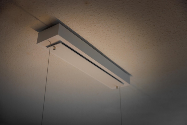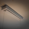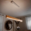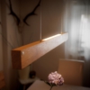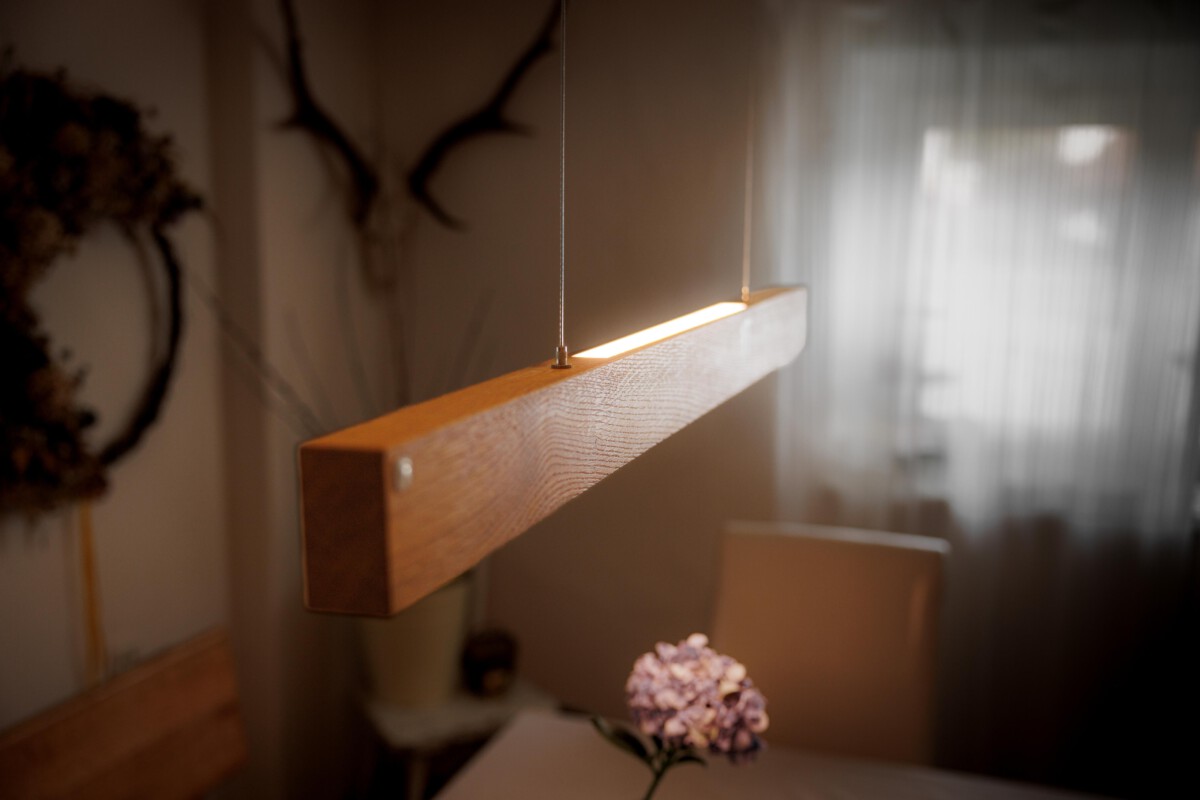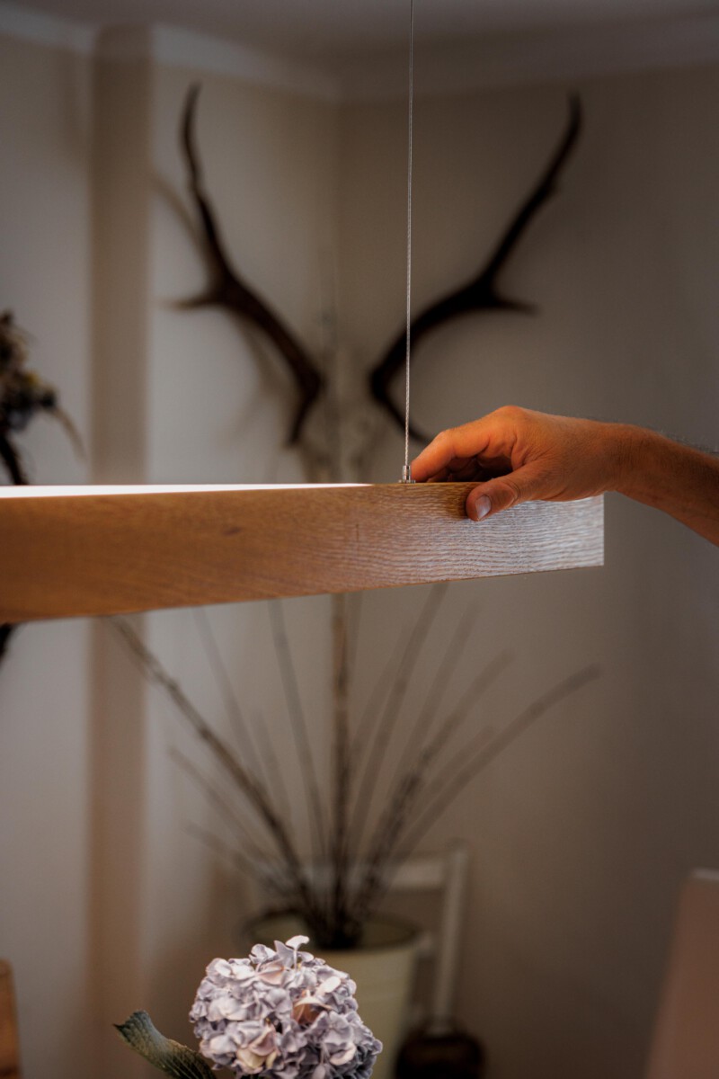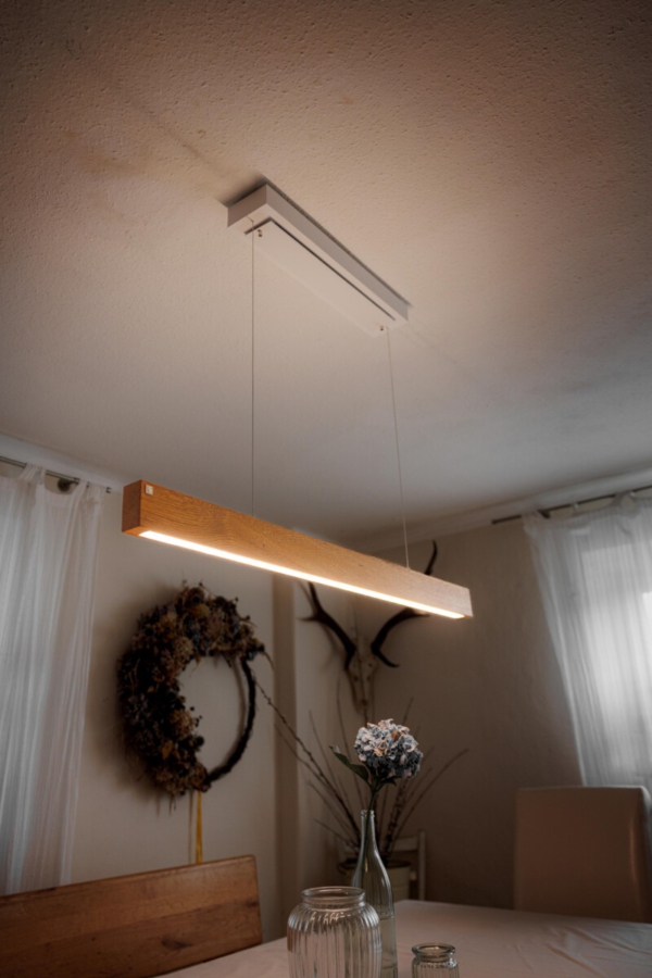 Ein edler Holzbalken schwebt über dem Tisch und trägt Licht. Die lebendige Maserung, eingefasst in klare Kanten, zeigt einen Ausschnitt des Baumes – elegant und präzise im Design. In beliebiger Höhe thront der schlanke Balken über dem Tisch und harmoniert stilvoll mit einem Holztisch oder bildet reizvollen Kontrast. Ein graviertes Silberemblem markiert die Holzart – ein Hauch von Handwerkskunst. Abschließend ziert ein Baldachin in weiß unauffällig die Decke. Die hochwertige LED spendet warmweißes bis kaltweißes Licht. Das Oberlicht kann individuell geschalten werden und sorgt bei Bedarf für eine behagliche indirekte Beleuchtung der Decke. An- und Ausschalten, sowie Dimmen ist per Fernbedienung oder smart per Handy-App möglich.