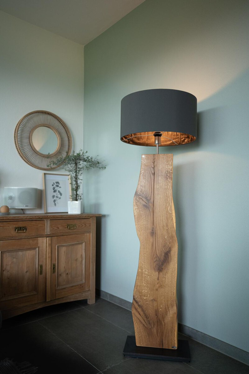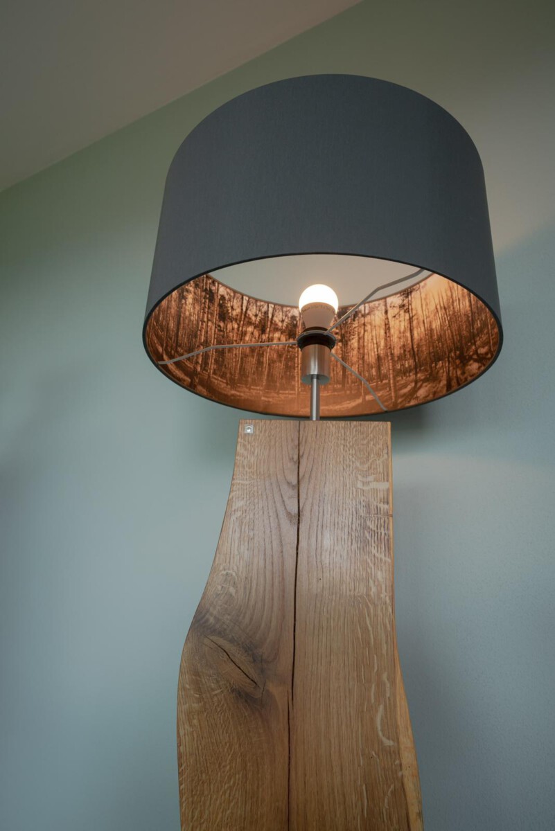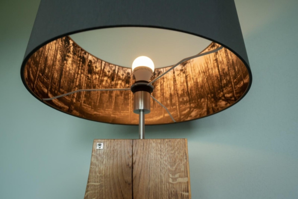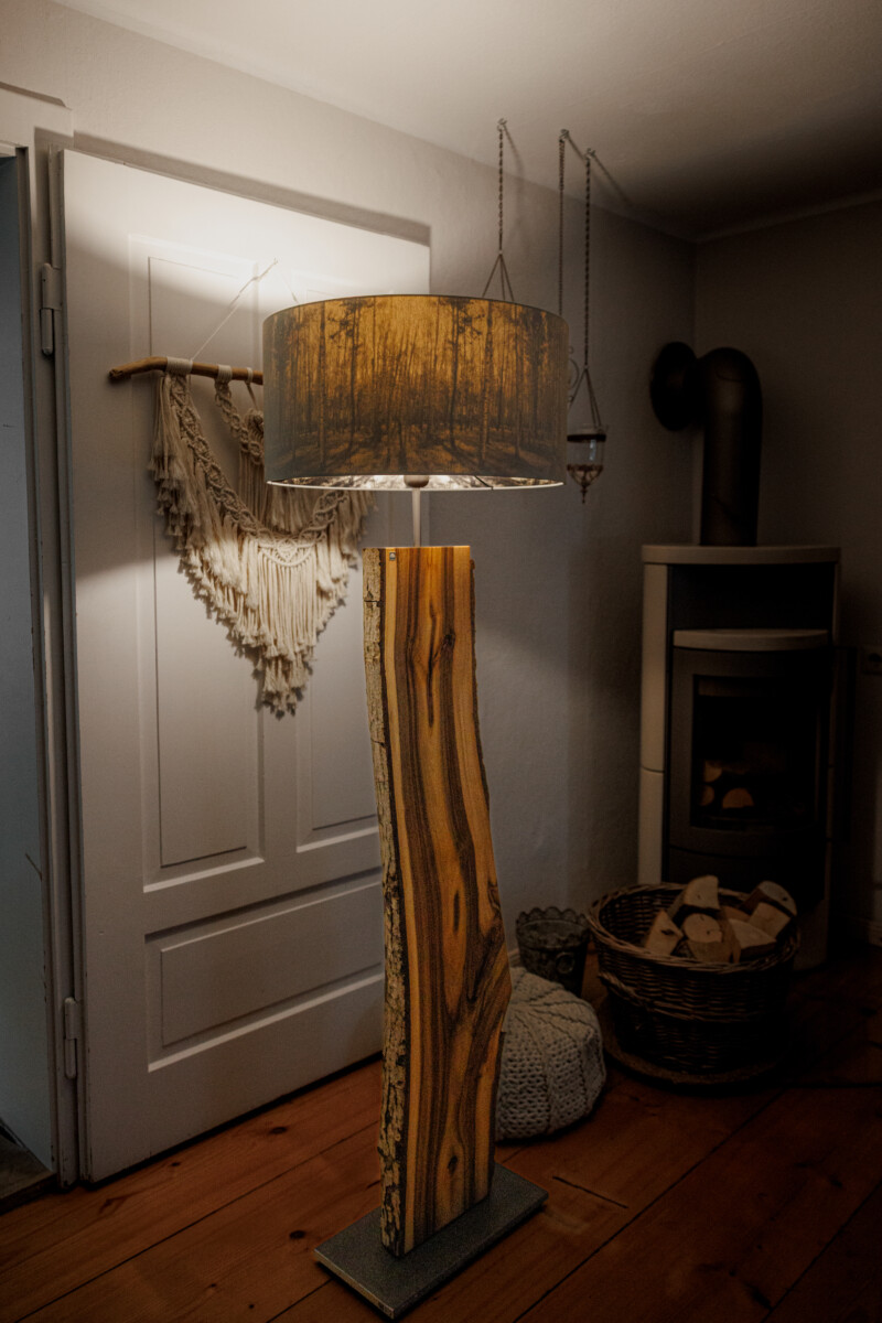 Im Längsschnitt eines jeden Baumstammes zeigt das Holz in unterschiedlichen Farbtönen seine Charakteristik. Das naturbelassene Holz stammt vorwiegend aus dem Allgäuer Voralpenland. Ob rötliche Obsthölzer oder Nußbaum in warmen Brauntönen mit dunklem Splint durchzogen, besticht jede dieser Leuchten durch ihren natürlichen Charme. Besonders hervorzuheben ist das Zusammenspiel der lebendigen Maserung mit dem warmen indirekten Licht. Die Leuchte ist mit einem soliden Fuß aus verzundertem Flachstahl versehen. Ein individueller, zur jeweiligen Holzart passender Leuchtenschirm mit Waldmotiv rundet Das Erscheinungsbild ab.