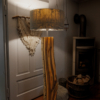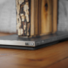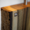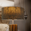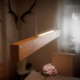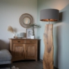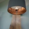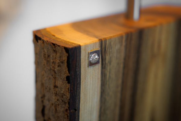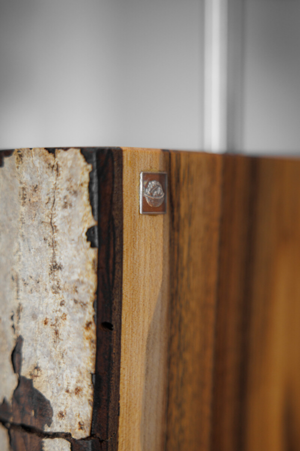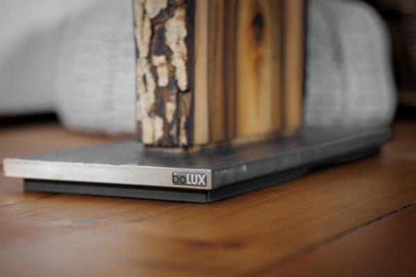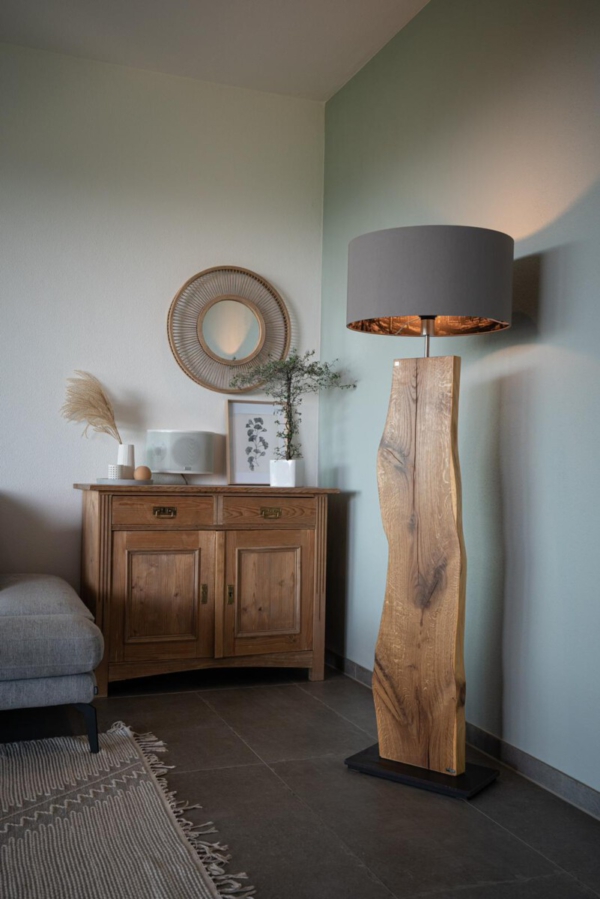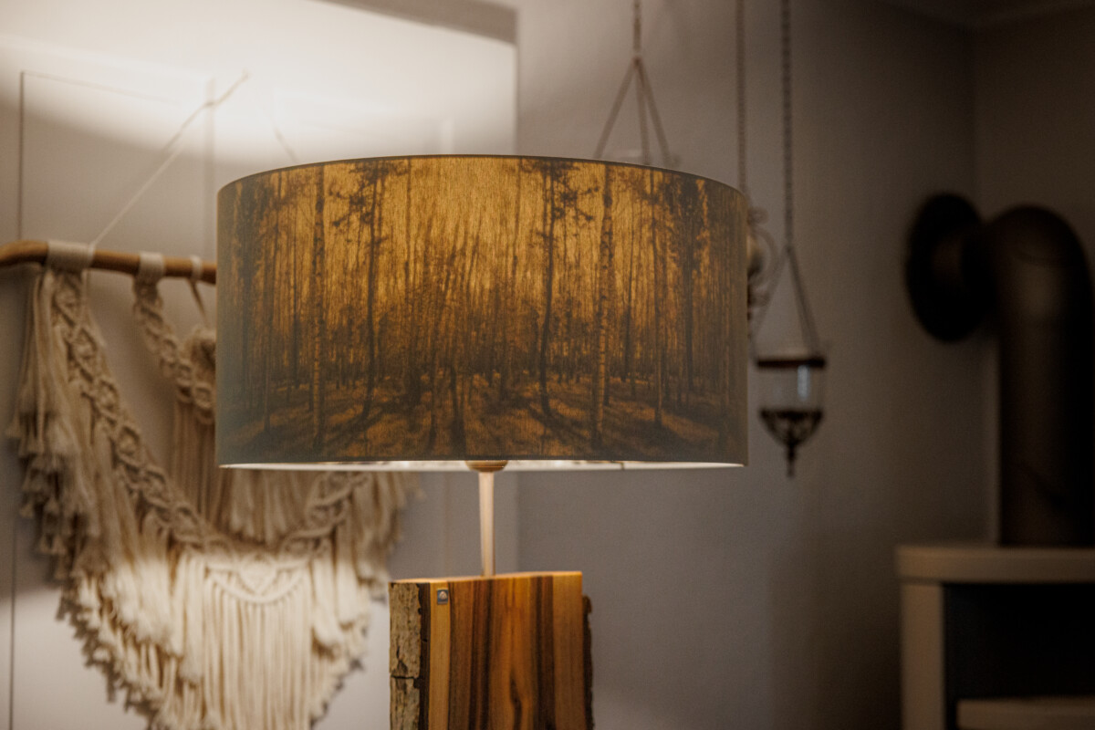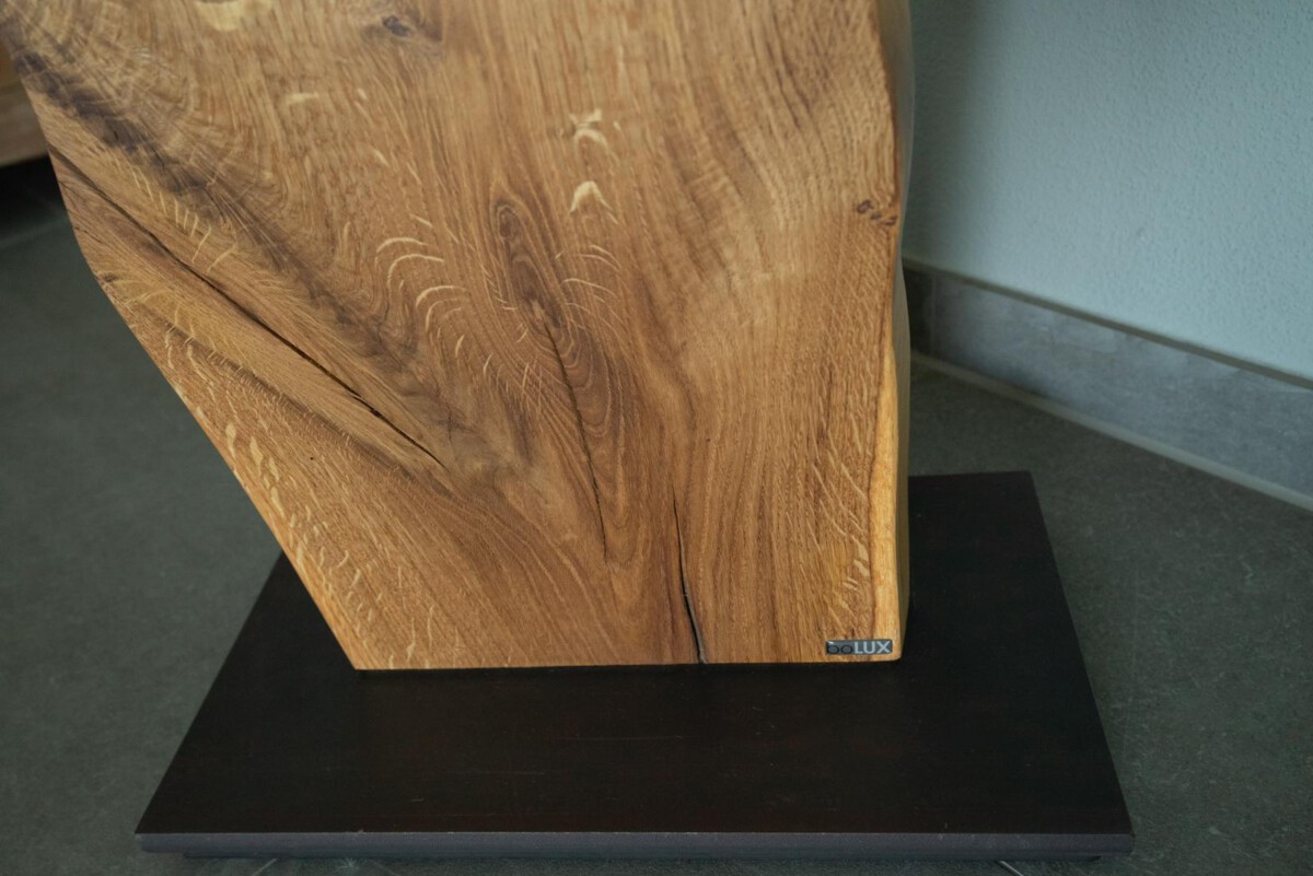 Im Längsschnitt eines jeden Baumstammes zeigt das Holz in unterschiedlichen Farbtönen seine Charakteristik. Das naturbelassene Holz stammt vorwiegend aus dem Allgäuer Voralpenland. Ob rötliche Obsthölzer oder Nußbaum in warmen Brauntönen mit dunklem Splint durchzogen, besticht jede dieser Leuchten durch ihren natürlichen Charme. Besonders hervorzuheben ist das Zusammenspiel der lebendigen Maserung mit dem warmen indirekten Licht. Die Leuchte ist mit einem soliden Fuß aus verzundertem Flachstahl versehen. Ein individueller, zur jeweiligen Holzart passender Leuchtenschirm mit Waldmotiv rundet Das Erscheinungsbild ab.